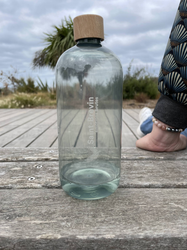 Le corps est fabriqué en 100% PET recyclé avec un bouchon à vis en bois de hêtre. L’intérieur du bouchon est en aluminium.